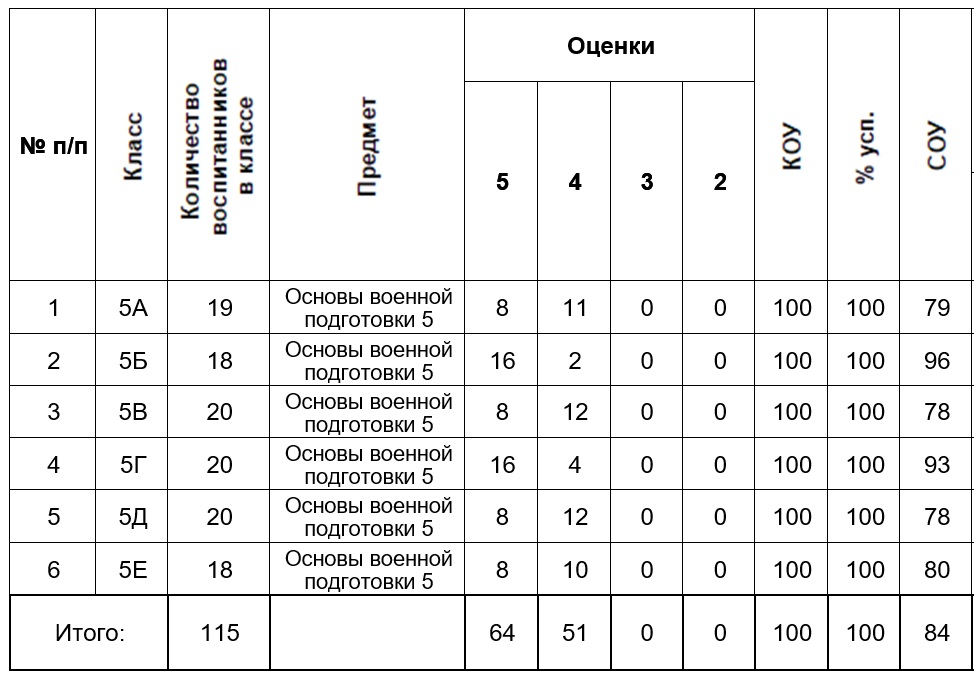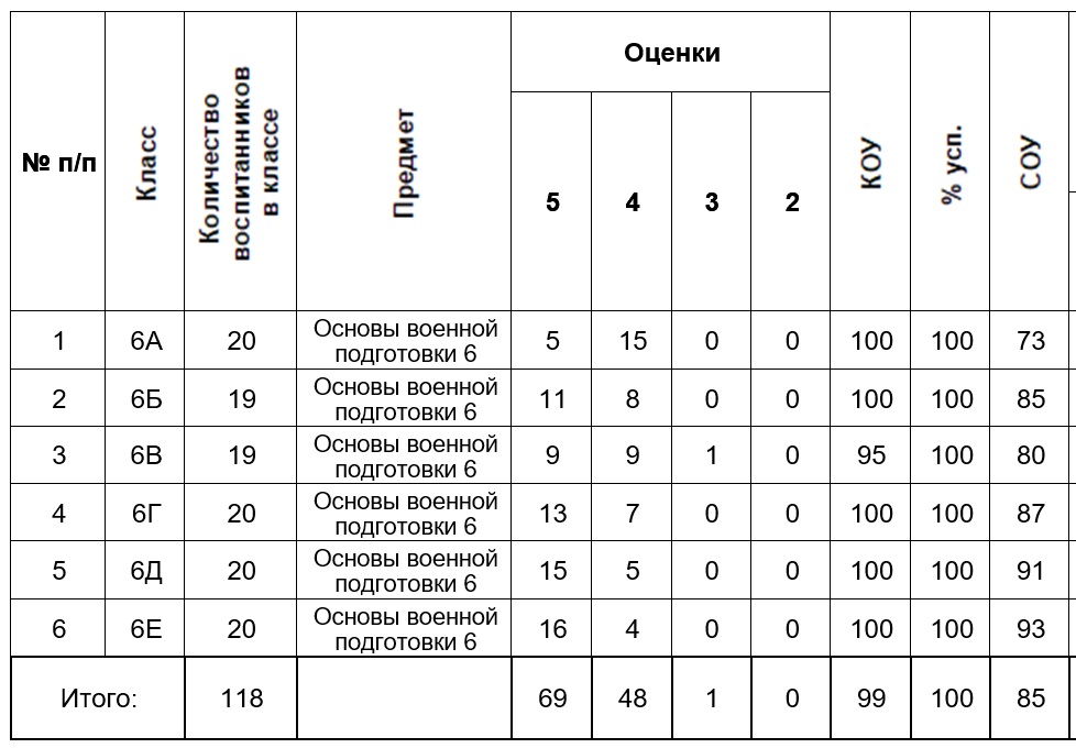 Учебный год завершен. Результаты успеваемости кадет 5, 6 и 8 классов показывают неизменный интерес кадет при изучении предмета «Основы военной подготовки».